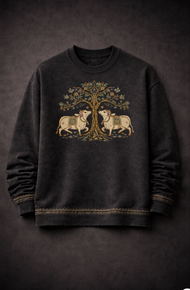 Inspired by pastoral temple imagery where sacred cows appear as symbols of abundance and cosmic harmony. The embroidered tree represents the Kalpa Vriksha—the mythic tree of life—while the mirrored cows evoke balance between nature, devotion, and agrarian culture within Indian visual traditions.
